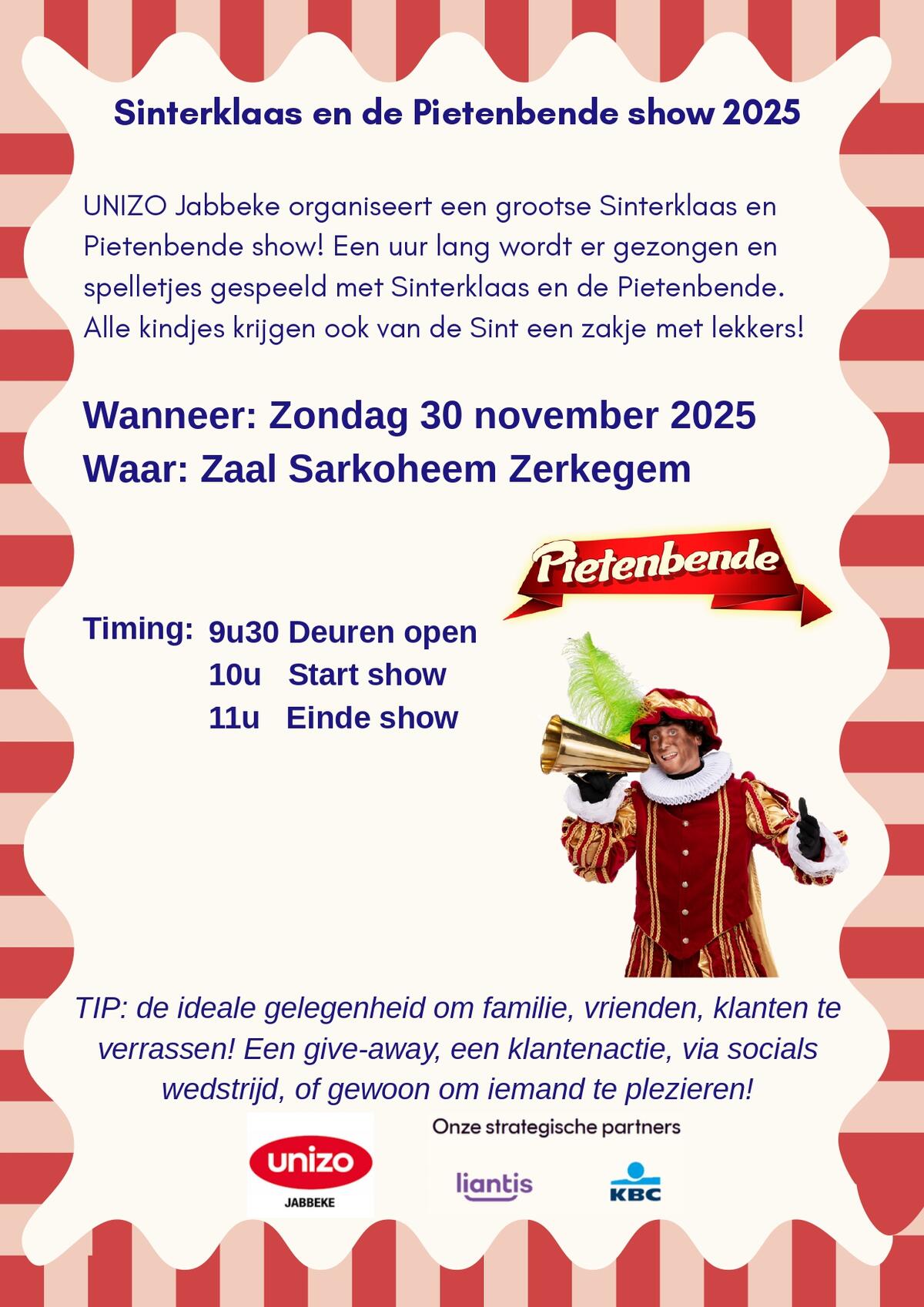 Berichten Nieuws Sinterklaas en de Pietenben... 19 november 2025 Sinterklaas en de Pietenbende show 2025 Meer info bij de bestuursleden UNIZO Jabbeke. Deel dit item: Nuttig voor jou UNIZO Jabbeke komt op! Lees meer