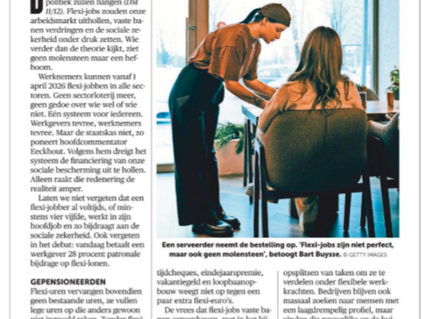 Bart Eeckhout schrijft vandaag dat flexijobs weldra als een “molensteen” rond de nek van de politiek zullen hangen. Een beeld dat best zwaar op de maag valt, maar vooral buikgevoel blijft. Flexijobs zouden onze arbeidsmarkt uithollen, vaste banen verdringen en de sociale zekerheid onder druk zetten. Wie verder dan de theorie kijkt, ziet geen molensteen, maar een hefboom.