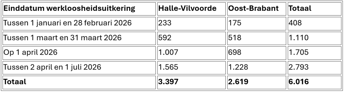 Tussen januari en juli 2026 verliezen in totaal 6.016 werkzoekenden in Vlaams-Brabant hun werkloosheidsuitkering, na een periode van minimaal 24 maanden. De grootste piek is voorzien vanaf 1 april 2026, wanneer 74% van de betrokken werkzoekenden hun uitkering ziet aflopen.